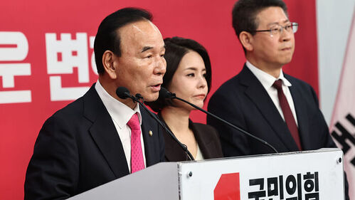 ▲ 국민의힘 박덕흠 공천관리위원장이 14일 서울 영등포구 여의도 중앙당사에서 6·3 지방선거 경북도지사 최종 후보에 이철우 현 경북도지사를 확정, 발표하고 있다