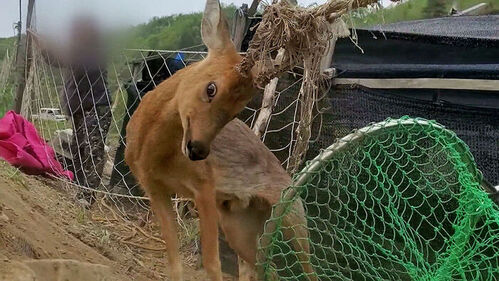 야생 동물로부터 농작물을 보호하기 위해 농민들이 김 양식용 그물을 쳐 놓은 건데 그물코가 어른 손바닥만큼 커 목과 날개, 뿔이 걸리기 쉽습니다.