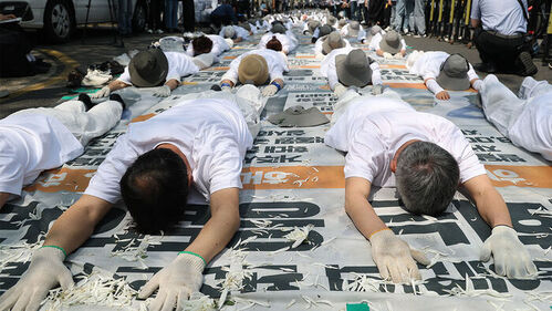 ▲ 전국장애인부모연대가 15일 서울 서대문구 경찰청 앞에서 연 '고(故) 김창민 영화감독 상해치사 사건 부실수사 규명 촉구 오체투지'에서 참가자들이 오체투지를 하고 있다.