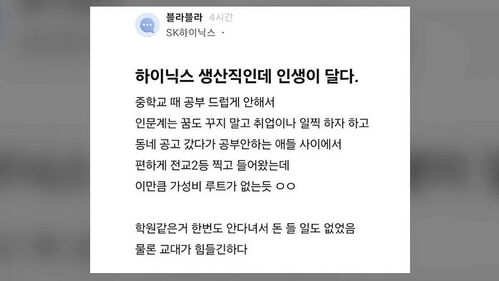 작성자 A 씨는 자신을 SK하이닉스 생산직 직원이라고 밝히며 "공부를 잘하지 못해 공업고등학교를 나와 취업했는데, 이만큼 가성비 좋은 선택은 없는 것 같다"고 적었습니다.