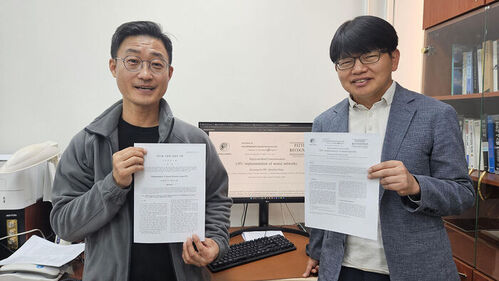▲ 2004년 발간 논문 표지 선보이는 정기철(왼쪽)·오경수 숭실대 교수