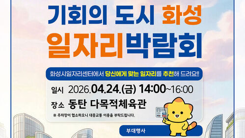 경기 화성특례시는 오는 24일 오후 2~4시 동탄 다목적체육관에서 '2026년 화성시 일자리박람회'를 개최한다고 16일 밝혔습니다.