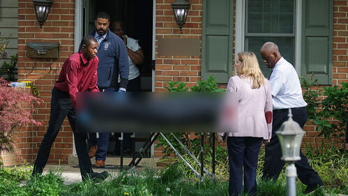 ▲ 전 버지니아 부지사 페어팩스의 자택 밖에서 들것에 실린 시신이 옮겨지고 있다.