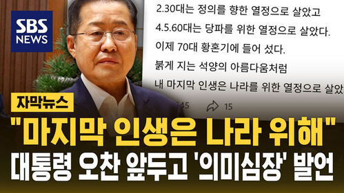 홍 전 시장은 "20대와 30대에는 정의를 향한 열정으로, 40대부터 60대까지는 당파를 위한 열정으로 살았다"며 "70대 황혼기에 들어선 지금 마지막 인생은 나라를 위한 열정으로 살았으면 한다”라고 적었습니다.