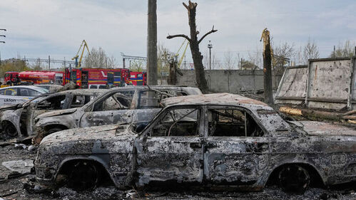 ▲ 17일 키이우 공습으로 망가진 차량들