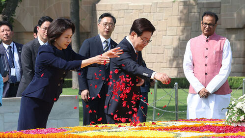 인도를 국빈 방문한 이재명 대통령이 마하트마 간디 추모공원에 헌화하며 세계 평화를 기원했습니다.