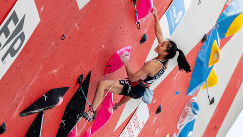 ▲ 서채현이 2025 IFSC 샤모니 리드 월드컵에서 등반하고 있다.