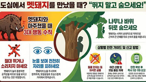 세종시소방본부가 도심에서 멧돼지를 맞닥트리면 뛰거나 소리를 질러 자극하지 말고 침착하게 뒤로 물러나 숨어야 한다는 시민 행동요령을 안내했습니다.
