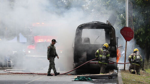▲ 지난 24일(현지시간) 콜롬비아 서부 칼리 군기지 인근에서 발생한 폭발로 타버린 버스