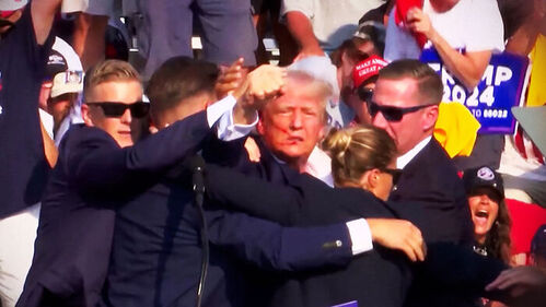 총알이 얼굴 옆을 지나 귓불을 관통했고, 얼굴에는 계속 피가 흐르는데도 트럼프는 주먹을 들어 올렸습니다.
