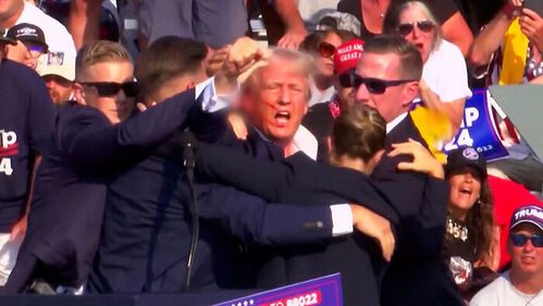 총알이 얼굴 옆을 지나 귓불을 관통했고, 얼굴에는 계속 피가 흐르는데도 트럼프는 주먹을 들어 올렸습니다.