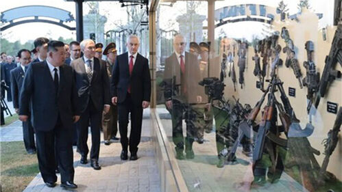 ▲ 러측 인사들과 '해외군사작전 전투위훈기념관'에 전시된 노획 무기 돌아보는 김정은