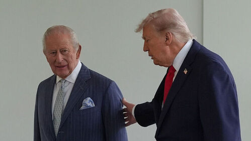 ▲ 도널드 트럼프 미국 대통령이 백악관 내부로 안내하며 찰스3세 영국 국왕 팔을 가볍게 접촉하는 모습