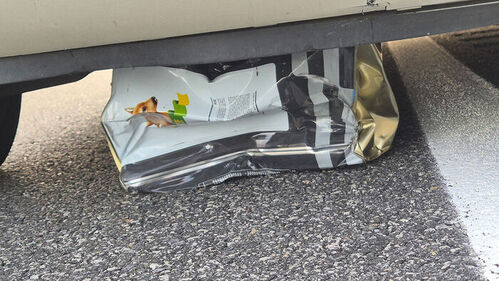 차에서 내려 확인해 보니 차 범퍼 밑에는 빈 페인트 통이 찌그러진 채 끼어 있는 상태였습니다.